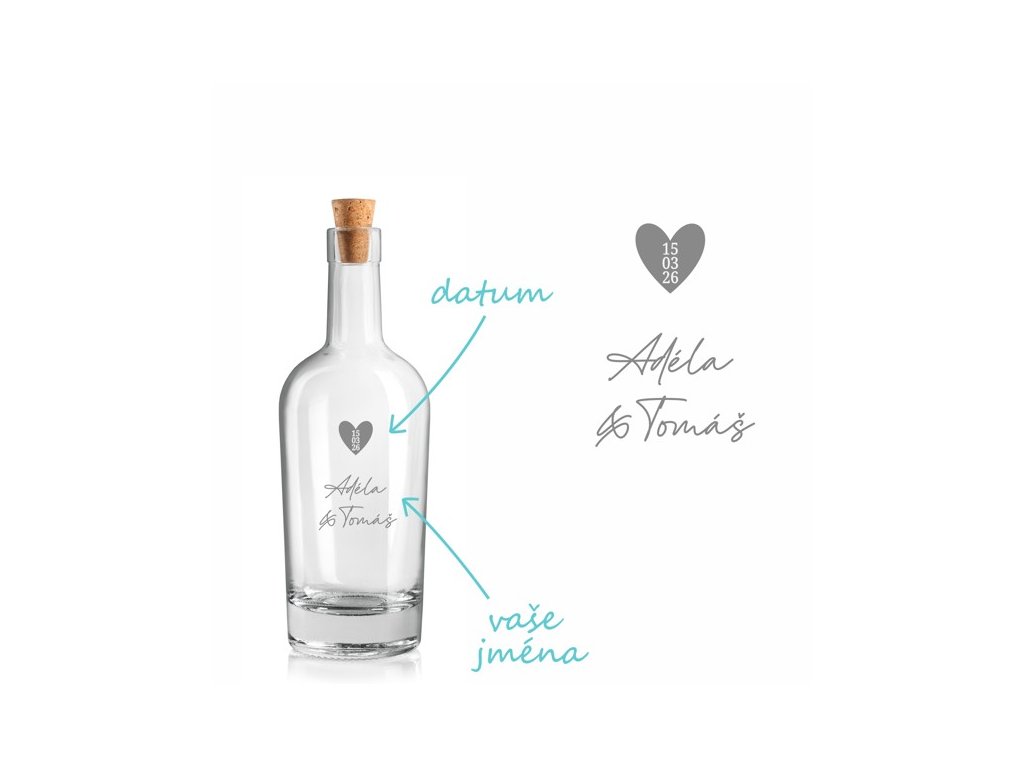 Stylová svatební láhev z čirého skla s pískovaným motivem srdce, jmény a datem svatby. Láhev je vybavena korkovou zátkou a je vhodná na slivovici, likér nebo jiné lihoviny.