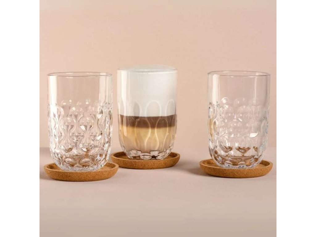 Sada 3 ks stylových sklenic na Latte Macchiato o objemu 390 ml a 3 ks podtácků z korku. Sklenice se od sebe liší vlisovanou dekorací a jsou vyrobeny z pevného silnostěnného skla, které je velmi odolné jak vůči nárazům, tak i vysokým teplotám, čímž umožňuje komfortní držení horkého nápoje a zároveň jej udržuje v optimální teplotě po delší dobu.