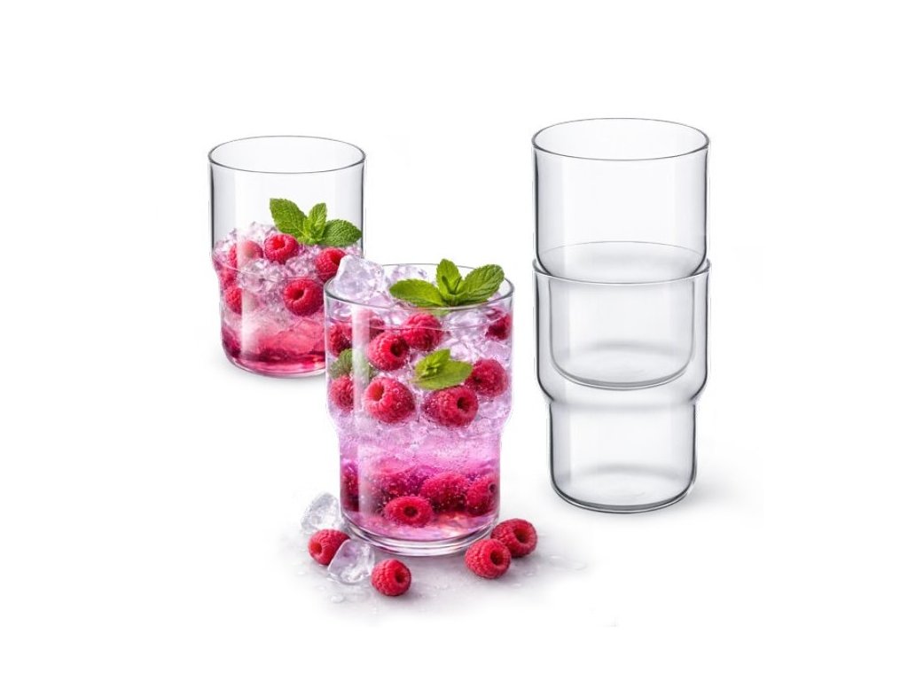 Velkou výhodou je stohovatelný tvar sklenic, díky kterému je lze ukládat do sebe a ušetřit tak místo ve skříňce. Promyšlený design navíc umožňuje stohování přímo do hrdla džbánu Bistro ze stejné kolekce, takže při servírování vytvářejí praktický a kompaktní set.