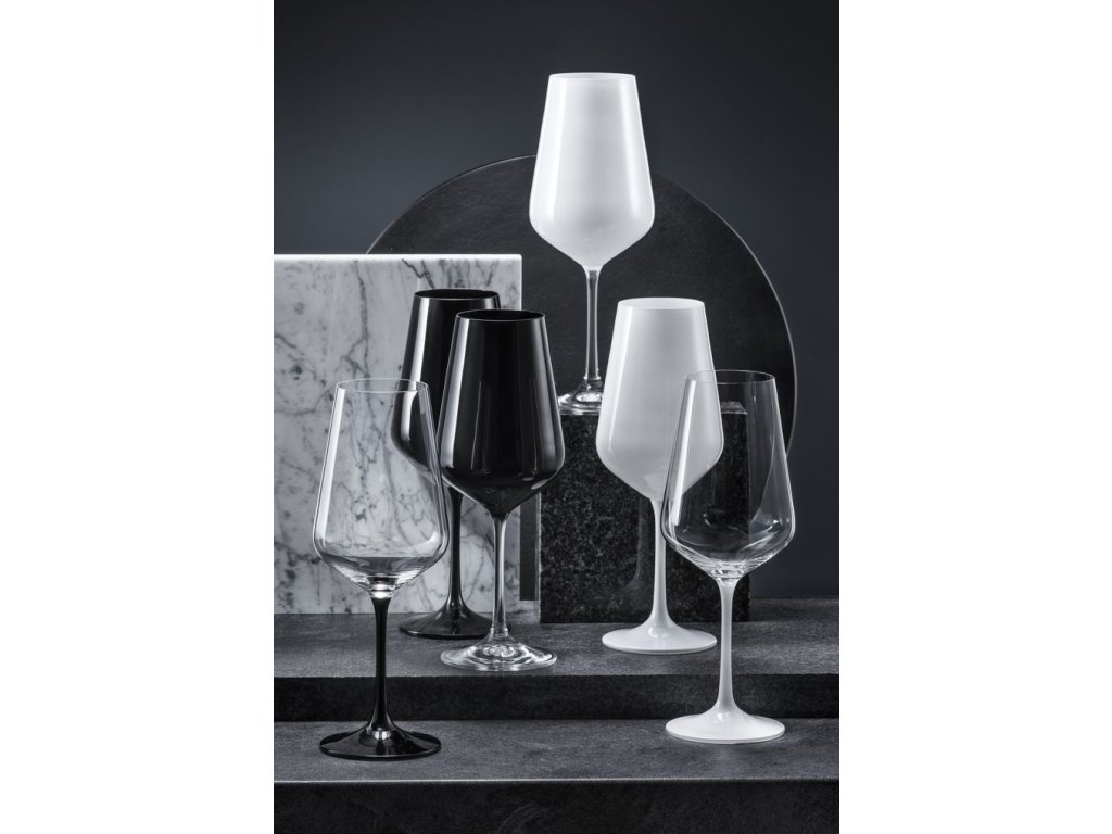 Skleničky vhodné na bílé i červené víno z kolekce BLACK&WHITE TWO jsou skutečným designovým kouskem, který vyniká díky barevné nožce v černé barvě. Už s jediným pohledem na tyto sklenice vám bude jasné, že se budou vyjímat i na vašem stole. A kdo že stojí za jejich vznikem? Nikdo jiný než oblíbená česká značka Crystalex.